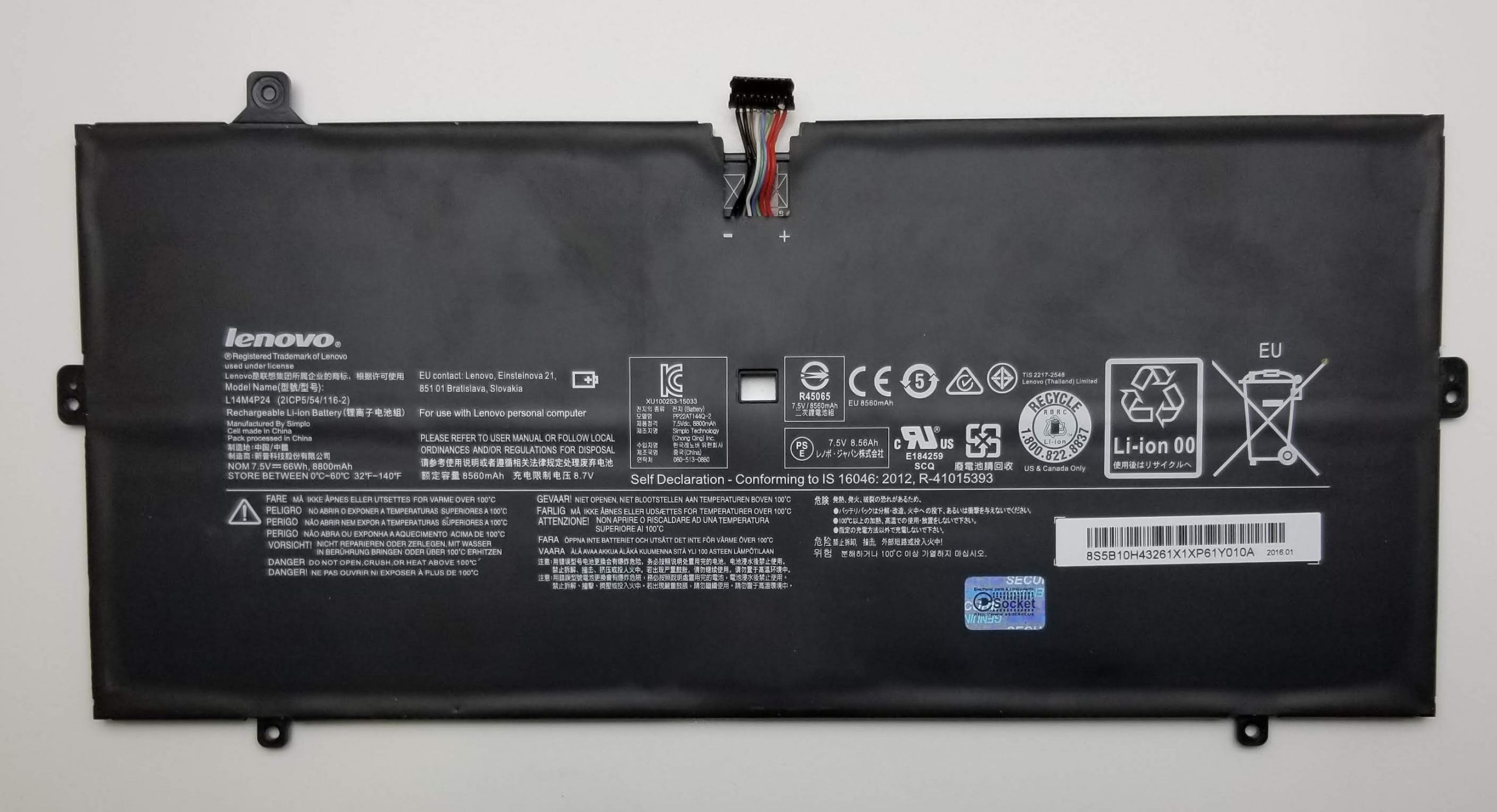 OEM Lenovo Yoga 900-13ISK Battery, 7.5V 66Wh 8800mAh 4-Cell L14M4P24. Removed from working laptop.
