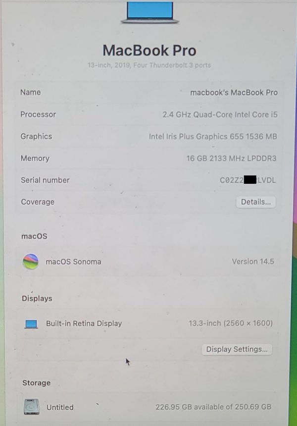 - 📌 MacBook Pro “Core i5” 2.3GHz (I5-8259U) – MR9Q2LL/A