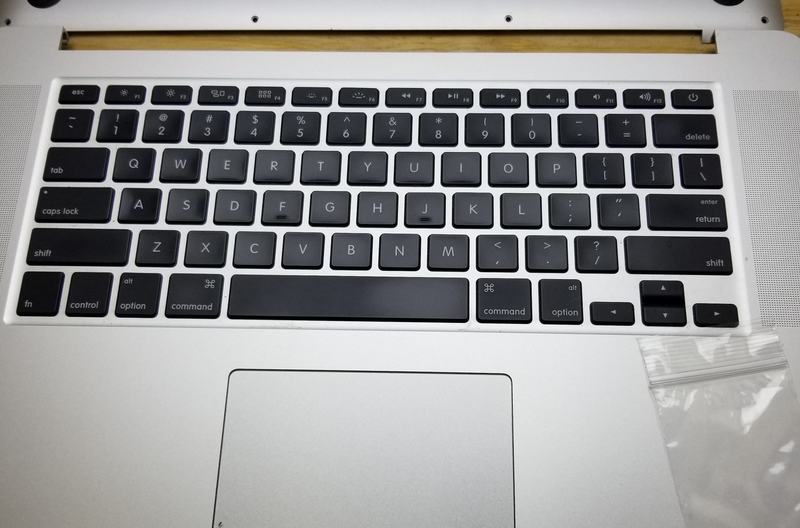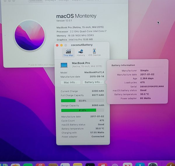 Original Apple MacBook Pro 15″ A1398 Mid 2015 Top Case Keyboard, Original Battery (Cycle Load 475, Capacity Life Remaining 81%) , TrackPad, Speakers, Bottom Cover, I/O Board, Bottom Cover screws. All keys & Trackpad TESTED