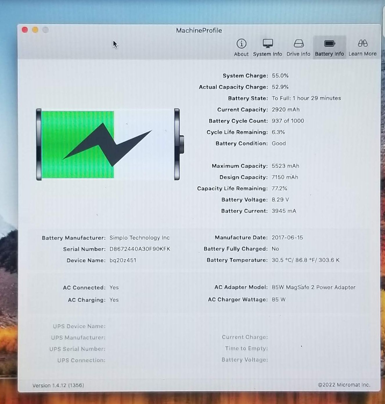 Original Battery MacBook Air 13″ A1466 A1496 020-8145-B Capacity 77-80% LoadCycles 700-937 ( no screws). Removed from MacBook Air 2017.