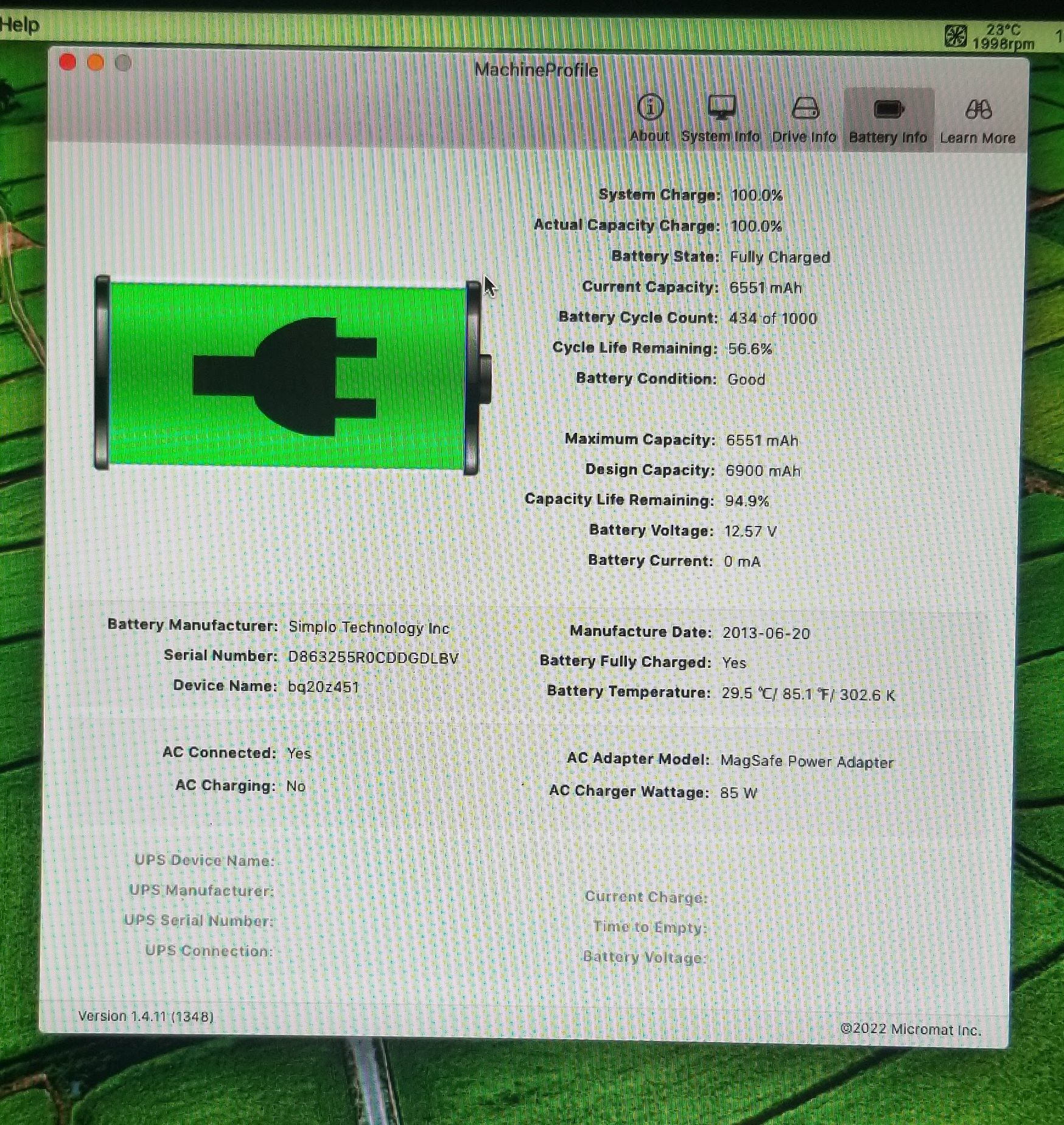 | Notes | 95% Full capacity / 434 Сycles |