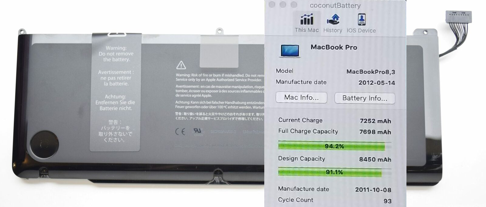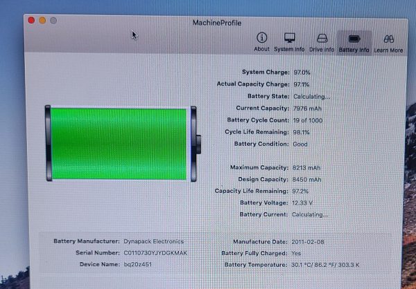 Original Battery Apple MacBook Pro 17″ A1297 2011 A1383 020-7149-A (97% / 19 cycles). Removed from working macbook, Good capacity condition.