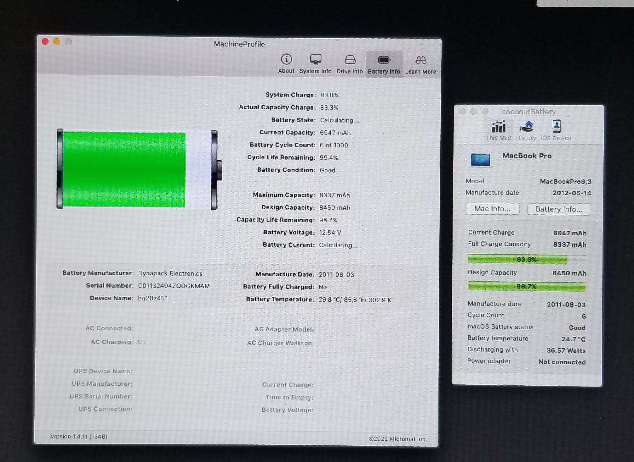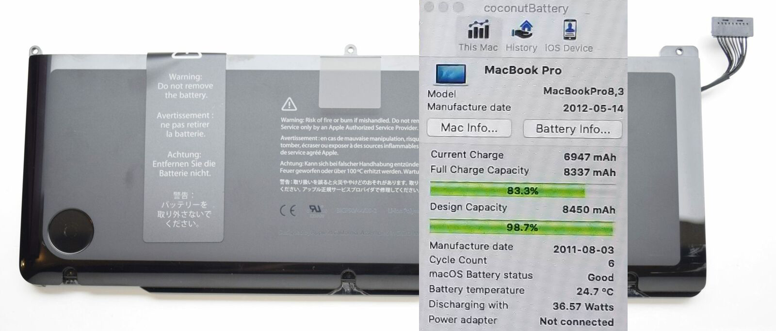 Original Battery Apple MacBook Pro 17″ A1297 2011 A1383 020-7149-A (98% / 6 cycles). Removed from working macbook, Good capacity condition.